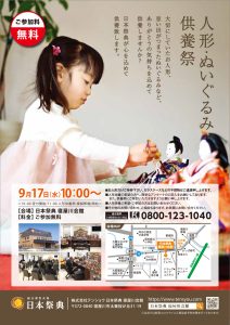 日本祭典寝屋川会館にて、人形・ぬいぐるみ供養祭を開催いたします。